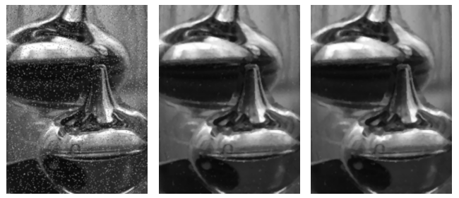 Aquest càlcul no crea un nou valor, i un píxel no representatiu del veïnatge no afectarà el resultat. Així doncs, el filtre conserva les vores i els cantons rodons. S’utilitza per a reduir el soroll, sobretot el soroll sal i pebre, i per a eliminar ratllades de les fotografies.