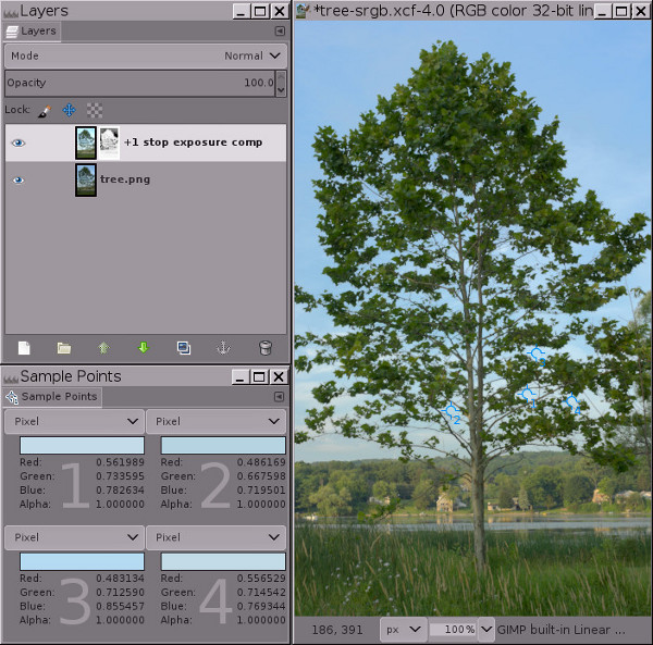 Descarregueu-vos tree.png, que és una imatge sRGB en enters de 16- bits. El GIMP de gran profunditat de bits és de fet un editor d'imatges «només sRGB», de manera que millor és no intentar editar-lo en altres espais de treball RGB.