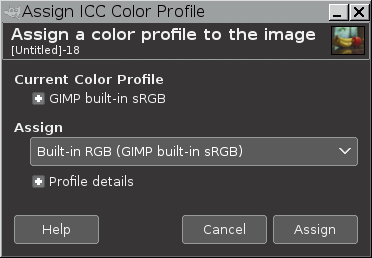 Billedet har måske en indlejret sRGB-profil, men du vil tildele en indbygget sRGB-profil i GIMP i stedet for den indlejrede sRGB-profil. Eller omvendt, måske er billedet i GIMPs indbyggede sRGB-farverum, men du vil tildele en sRGB-profil fra disken.