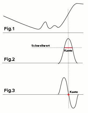 Die meisten der Filter zur Kantenerkennung basieren auf der Analyse von Farbveränderungen und erzeugen dicke Kantenlinien. Beachten Sie den ersten Teil der Abbildung (Fig.1), welche die Veränderungen der Farbintensität symbolisch darstellt. Auf der linken Seite befinden sich leichte Veränderungen, welche keine Kanten darstellen. Auf der rechten Seite sehen Sie eine Kante, dargestellt als Änderung der Farbintensität. Die zweite Abbildung (Fig.2) zeigt die Stärke der Veränderung der Farbintensität. Dies ist mathematisch betrachtet die erste Ableitung des Graphen im ersten Teil der Abbildung. Ein Algorithmus zur Kantenerkennung muss nun entscheiden, ab welcher Höhe der Ableitung eine Kante als erkannt gilt. Dies entspricht im Wesentlichen der Arbeitsweise des Sobel-Filters.