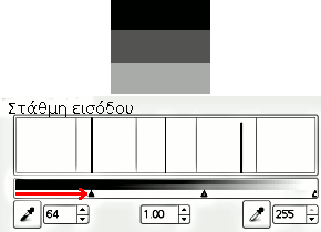 Οι στάθμες εισόδου χρησιμοποιούνται για φωτισμό τονισμών (λαμπεροί τόνοι), σκοτεινών σκιών (σκοτεινοί τόνοι), αλλαγή της ισορροπίας λαμπερών και σκοτεινών τόνων. Μετακίνηση ολισθητών στα αριστερά για αύξηση φωτεινότητας (αύξηση του επιλεγμένου χρώματος / αύξηση αδιαφάνειας). Μετακίνηση ολισθητών προς τα δεξιά για μείωση της σχετικής φωτεινότητας (lightness) (μείωση του επιλεγμένου χρώματος / μείωση αδιαφάνειας).