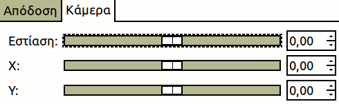 Στο κύριο παράθυρο, μπορείτε να ορίσετε τις παραμέτρους Απόδοσης και Κάμερας. Οι πρώτες τρεις παράμετροι στην εμφάνιση απόδοσης είναι Φωτεινότητα (Brightness), Αντίθεση και Γάμμα. Το αποτέλεσμα αυτών των επιλογών είναι ορατό στο παράθυρο προεπισκόπησης. Όμως, είναι γενικά καλύτερο να παραμείνετε στις προεπιλεγμένες τιμές και να διορθώσετε την αποδιδόμενη εικόνα αργότερα με εργαλεία στο μενού Χρώματα.