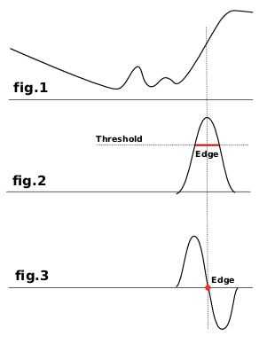 La mayoría de ellos se basan en métodos de cálculo sobre degradados y generan líneas gruesas. Mire la fig. 1 que representa las variaciones de intensidad de color. A la izquierda, hay un degradado lento de color que no es un borde. A la derecha, una variación rápida que es un borde. Ahora, se calcula el degradado, la velocidad de variación, de este borde: por ejemplo la primera derivada (fig. 2). Hemos decidido que se detecte el borde cuando el degradado sea mayor que el valor del umbral (el borde exacto está en la cima de la curva, pero esta cima varía según los bordes). En la mayoría de los casos, el umbral está bajo la cima y el borde es grueso.