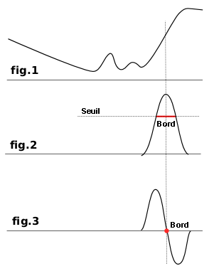 La plupart d’entre eux sont basés sur des méthodes de calcul de gradient et donnent des bordures épaisses. Considérez la figure 1 qui représente des variations d’intensité de couleur. Sur la gauche se trouve un lent dégradé de couleur qui n’est pas un bord. Sur la droite, une brusque et importante variation est un bord. Maintenant, calculons la pente, la vitesse de variation, de ce bord : c’est la dérivée première (fig.2). Nous devons décider qu’un bord est détecté quand la pente dépasse un certain seuil (le bord se trouve exactement au sommet de la courbe mais on ne peut l’utiliser car son niveau varie selon les bords). Dans la plupart des cas, le seuil se trouve en dessous du sommet et le bord est épais.