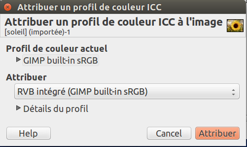 L’image a un profil sRVB intégré, mais vous désirez lui attribuer un profil sRVB intégré à GIMP. Ou, inversement, l’image a un profil sRVB intégré à GIMP et vous voulez lui attribuer un profil sRVB depuis le disque.