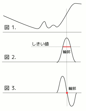 ラプラス フィルターの輪郭抽出には第 2 次導関数 (図3.) を使用します。 曲線の頂点がここでは 0 を指すのではっきりと認識できます。 このしくみがあるからラプラスフィルターはたった 1 ピクセル幅の細い輪郭を描くのです。 しかしこの導関数は小さな波にも 0 を指して 0 があちこちにできるので、 誤った輪郭を掴むおそれがあります。