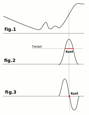 Dei fleste av desse filtra analyserer fargeskilnadane i biletet og gjev til dels nokså tjukke kantlinjer. Sjå på fig. 1 som viser variasjonar i fargeintensiteten. Til venstre forandrar fargen seg lite, og dermed finn ein ingen kant der. Til høgre forandrar fargen seg meir at det er råd å finna ein kant. Det er no råd å rekna ut fargevariasjonane for dette området. Figur 2 viser den første avleiinga av desse utrekningane. Me må bestemma at ei grense vert oppdaga når fargeovergangen er større enn ein sett terskelverdi (den nøyaktige grensa er på toppen av kurva, men denne toppen varierer i høve til grensene). Som oftast er terskelverdien noko lågare enn denne toppen, og resultatet vert difor breie kantar.
