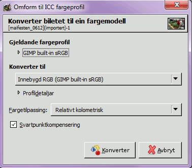 Du ønskjer å konvertere biletet frå ein fargemodell til GIMP sin innebygde sRGB-fargemodell.