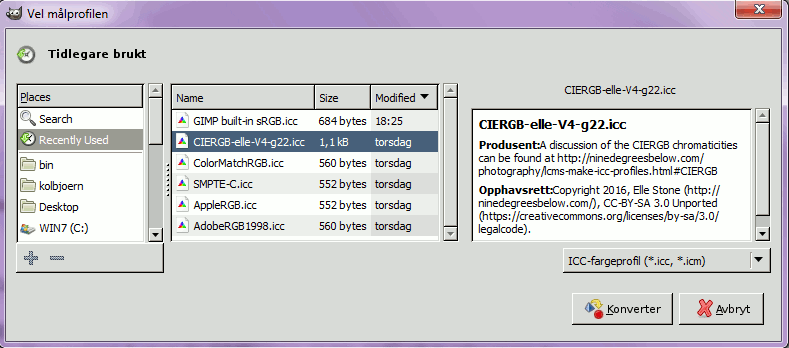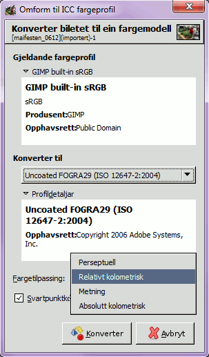 Under Gjeldande fargeprofil er ein omtale av den gjeldande fargeprofilen, i dette tilfellet den innebygde GIMP-profilen sRGB. Klikk på symbolet