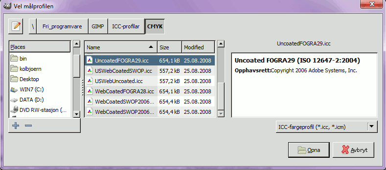 Trykkjer du på Vel fargeprofil frå disk … kjem dialogvindauget opp slik at du kan leita deg gjenom lagringsmedia etter den ønskte profilen. Vindauget har tre område: