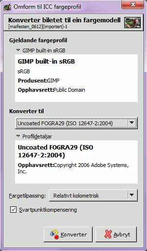 «Målprofilen» er profilen du vil byte til. «Kjeldeprofilen» er den ICC-profilen som opphavleg er brukt i bilete. |