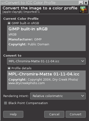 Let's say you have just finished editing an image. You edited the image in GIMP's built-in sRGB color space and now you want to convert a flattened copy of the image to a printer profile before sending it off to be printed. The screenshots below show the procedure: