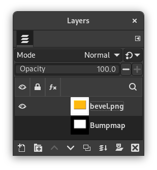 This filter adds a slight bevel to an image using a bump map (see below). If there is a selection, it is bevelled, otherwise the filter has no effect.