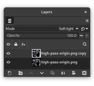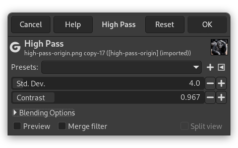 In sound processing, a high-pass filter filters high frequencies above a threshold. In digital images, frequency refers to sudden changes in brightness or color in neighboring pixels. The High Pass filter filters high essential details, and larger scale gradients are removed. This result, combined with the original image and "Soft Light" or "Hard Light" merge mode, is used to sharpen images. It enhances fine details.