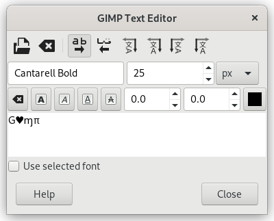 • Text to Path: this command creates a path from the outlines of the current text. The result is not evident. You have to open the Paths dialog and make path visible. Then select the Path tool and click on the text. Every letter is now surrounded with a path component. So you can modify the shape of letters by moving path control points.